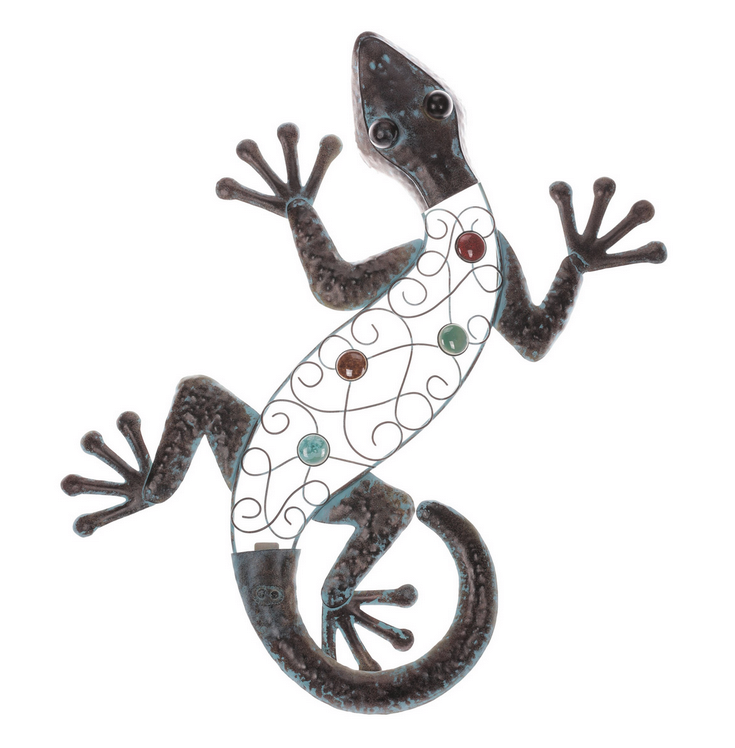 Jašterica - kovová závesná dekorácia do interiéru aj exteriéru doplnená farebnými kamienkami.