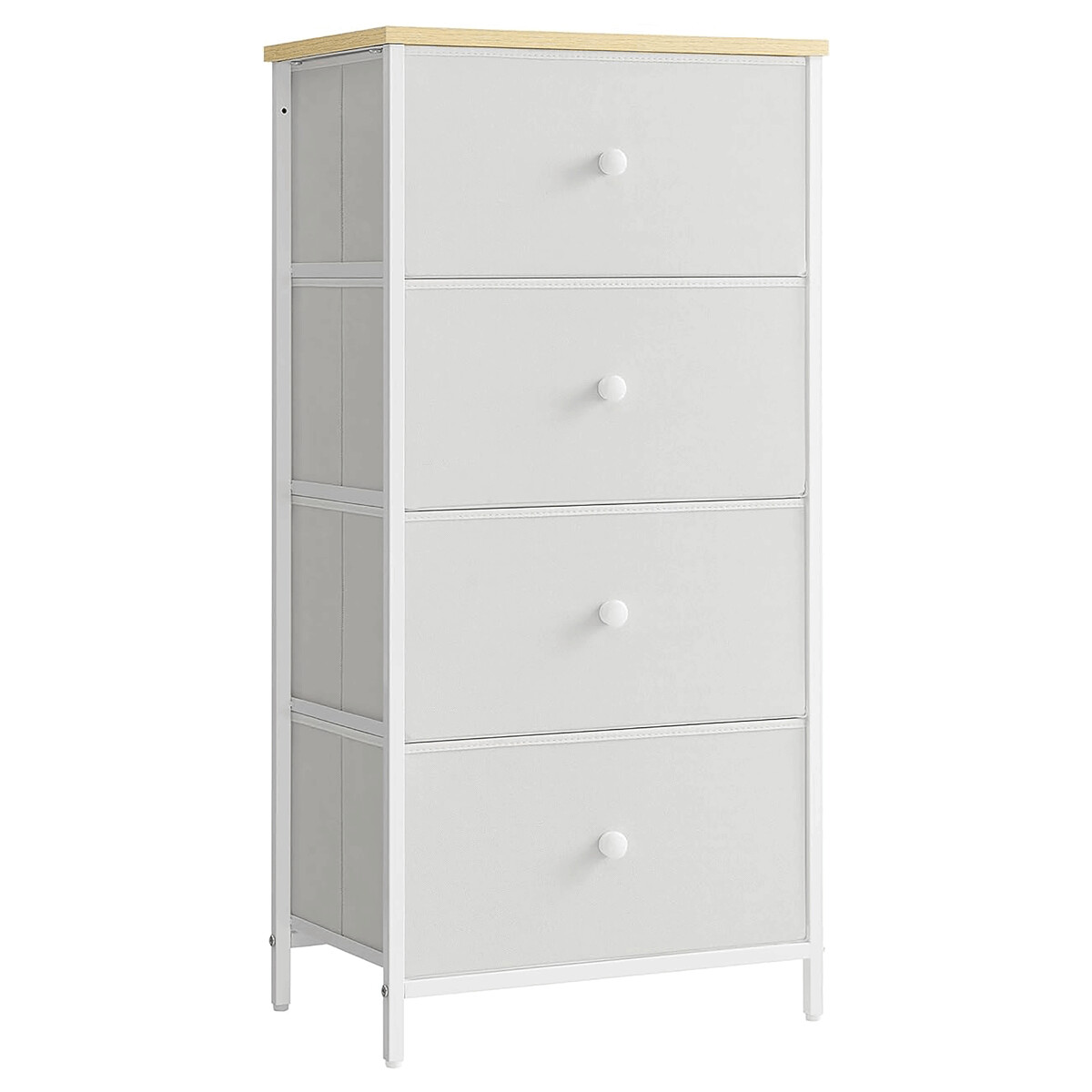 Štyri priestranné zásuvky z netkanej textílie v elegantnej sivej farbe ponúkajú dostatok priestoru na uloženie oblečenia, doplnkov či drobností v domácnosti. Biely rám a úchytky dodávajú komode čistý vzhľad, ktorý sa hodí do moderných, škandinávskych aj minimalistických interiérov.