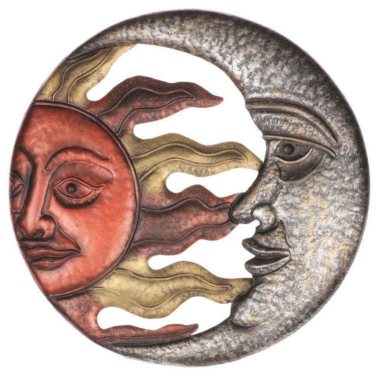 Kovová nástenná dekorácia s motívom slnka a mesiaca. Priemer 40 cm.