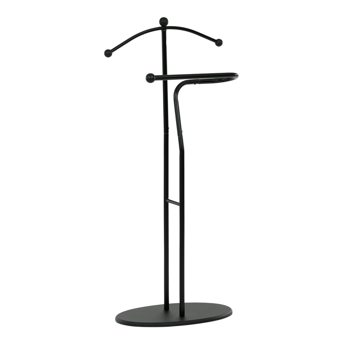 Ramienko na zavesenie saka alebo košele dopĺňa praktický držiak na nohavice či kravaty. Vďaka stabilnej oválnej základni stojí pevne na mieste a nezaberá veľa priestoru, takže sa hodí aj do menších interiérov. Kombinácia funkčnosti a štýlového vzhľadu robí z tohto nemého sluhu praktického pomocníka na každodenné používanie.