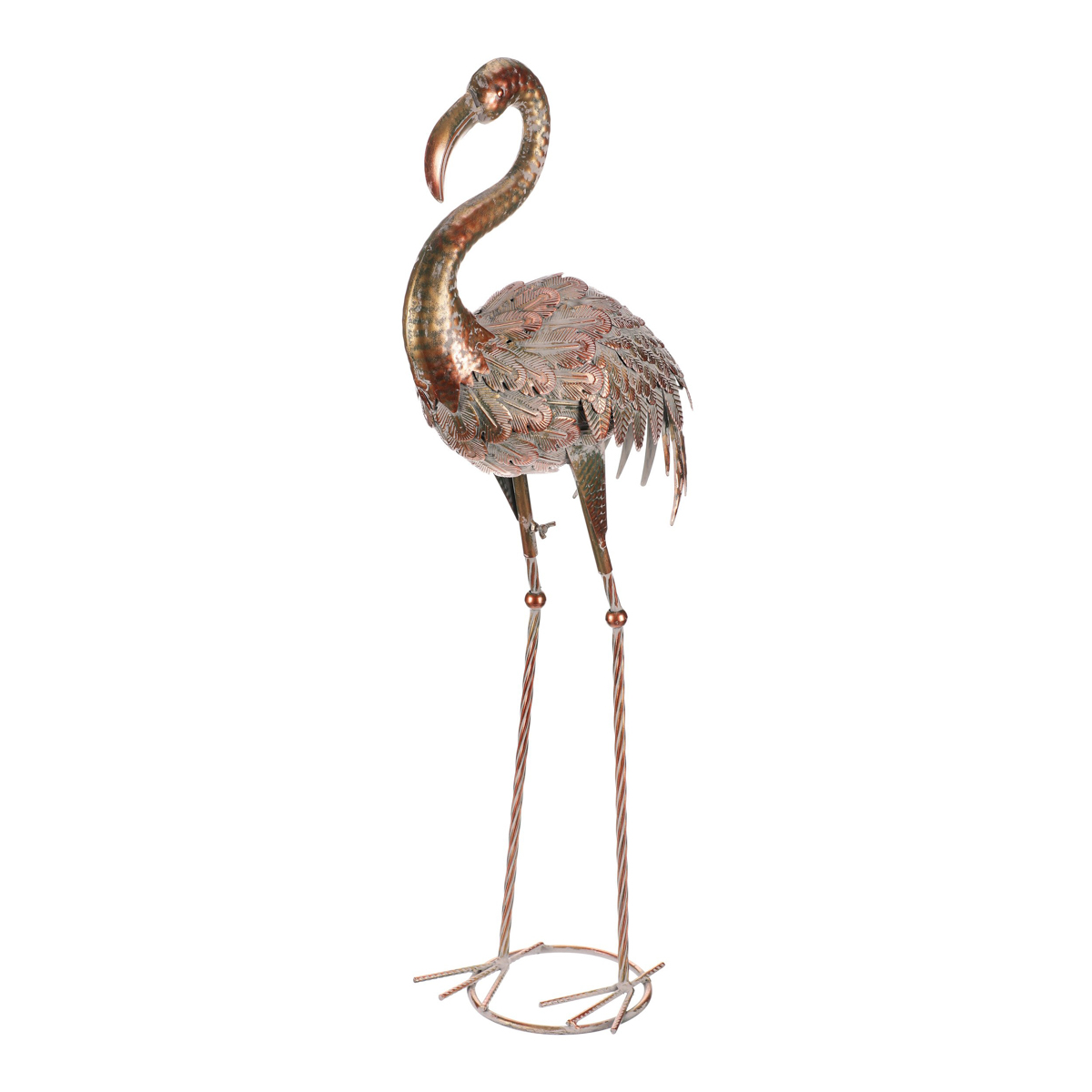 Elegantný plameniak s metalickým povrchom v medených a jemných kovových odtieňoch, vhodný do exteriéru.